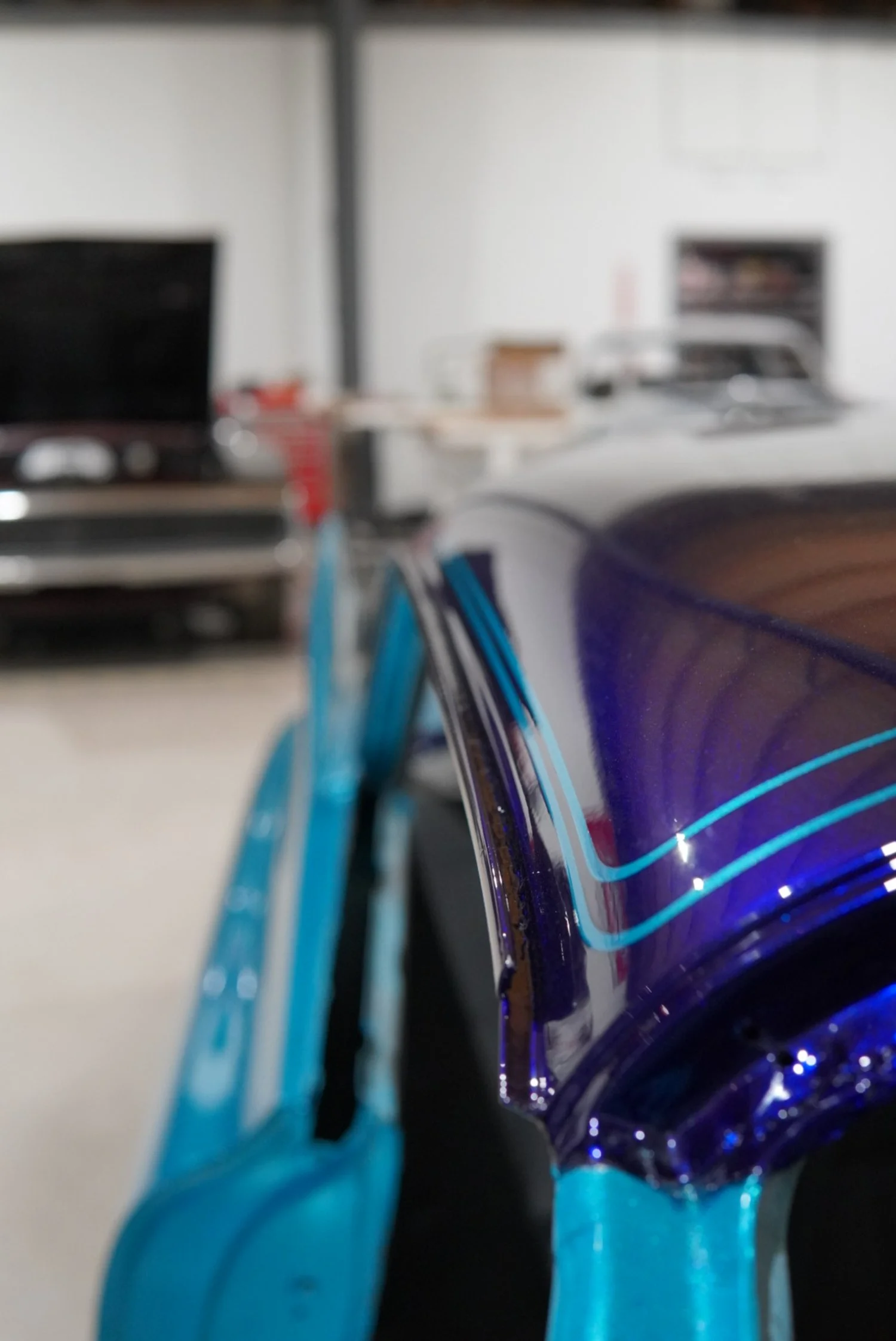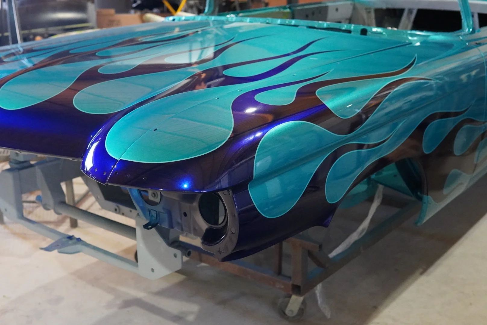 This 1959 Cadillac Coupe DeVille is a striking fusion of elegance and performance. Built on a Roadster Shop Fast Track chassis and equipped with air ride suspension, it glides with a stance as commanding as its presence. Power comes from a supercharged LT4 mated to a T56 Magnum, bringing modern muscle to one of Cadillac’s most iconic silhouettes. Beneath its vibrant blue paint, dark blue flames and silver accents flow seamlessly over sculpted bodylines, while custom floor pans and an intricately detailed engine bay showcase the craftsmanship beneath the surface. This Coupe DeVille reimagines classic luxury with contemporary precision—grace and power, perfectly balanced.